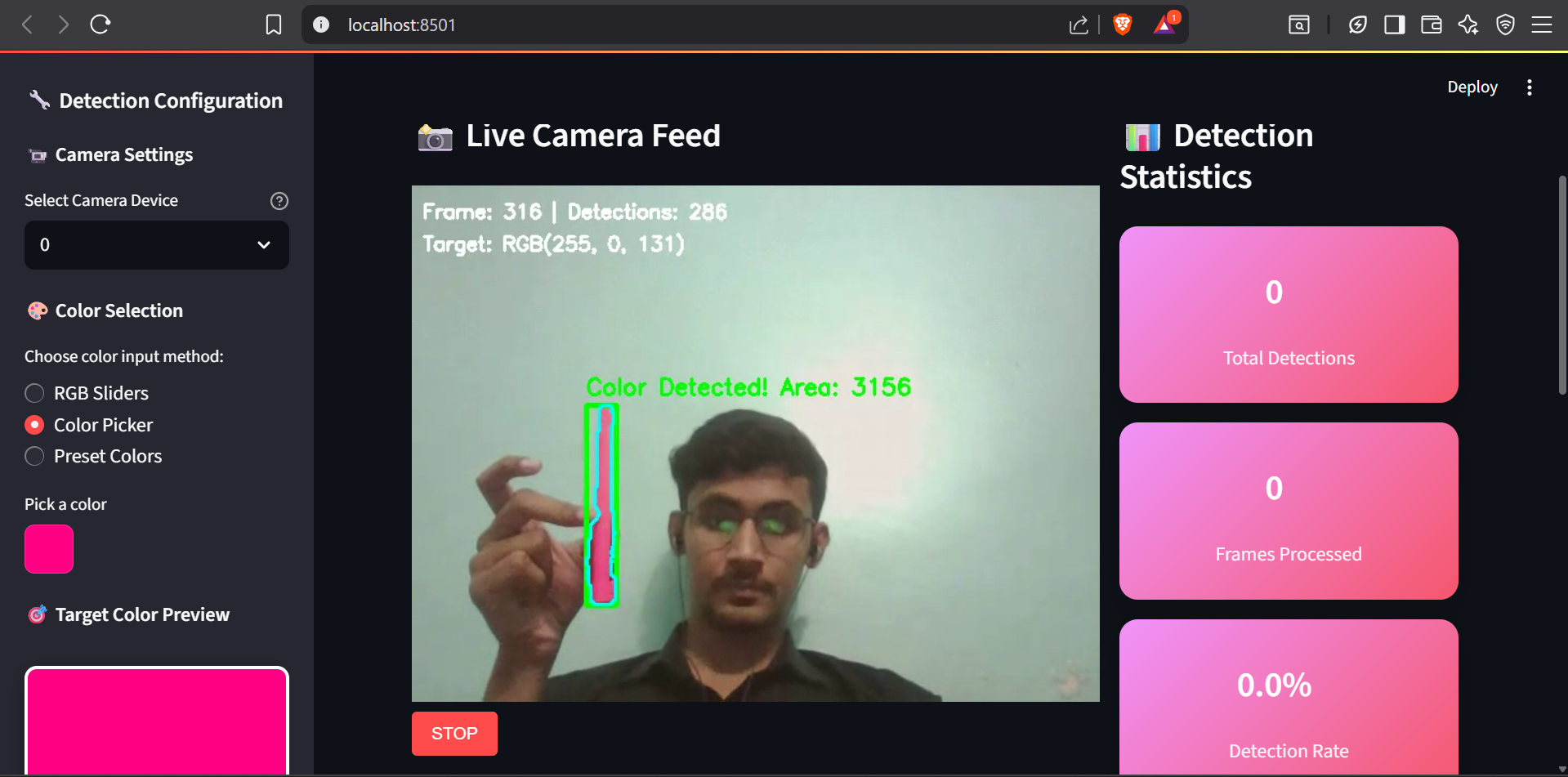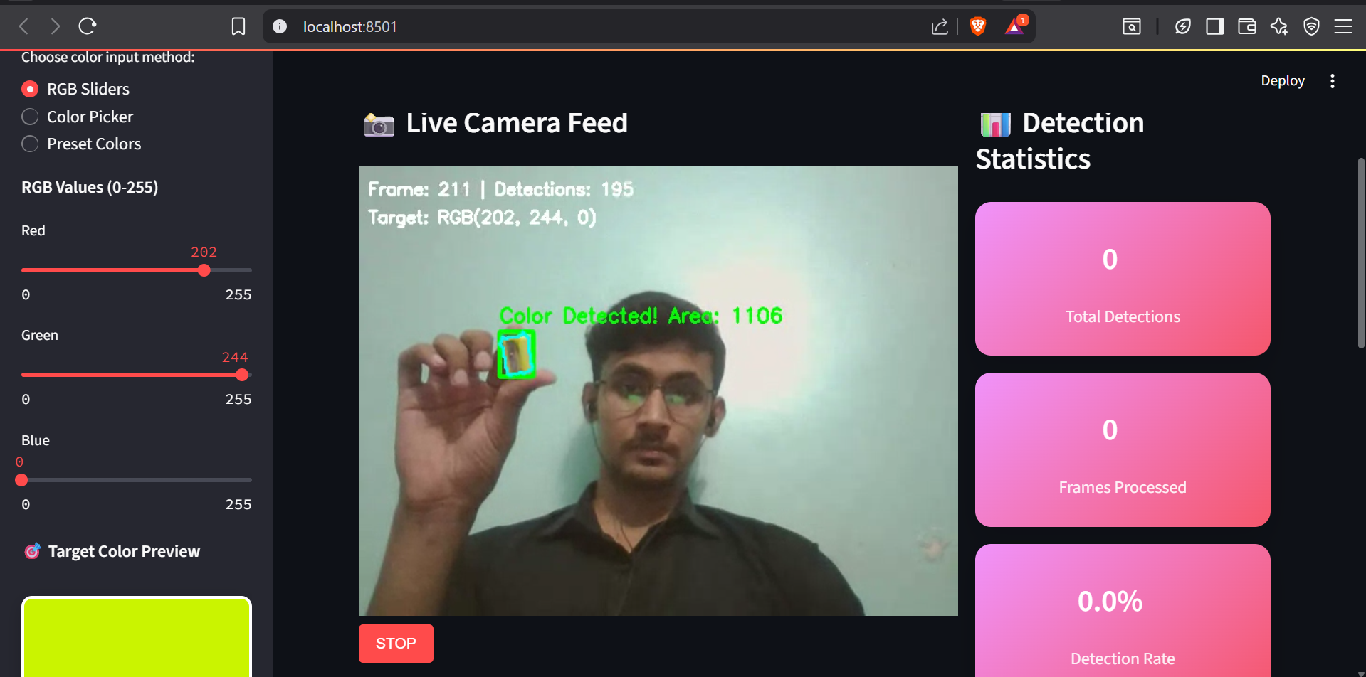 The AI Color Detection Studio is a sophisticated real-time system that detects and tracks specific colors in live video feeds.