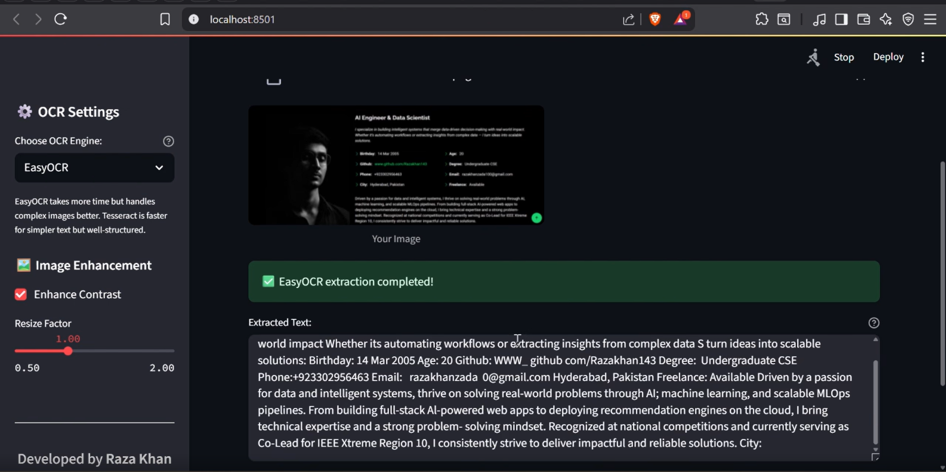 This project is built using Python and Streamlit for the frontend and interface, with EasyOCR for text extraction from images. It supports multiple image formats including PNG, JPG, and screenshots, and works seamlessly for both printed and handwritten text. Pandas is used for processing extracted data when needed, and the UI is enhanced with custom CSS for a clean, responsive design.