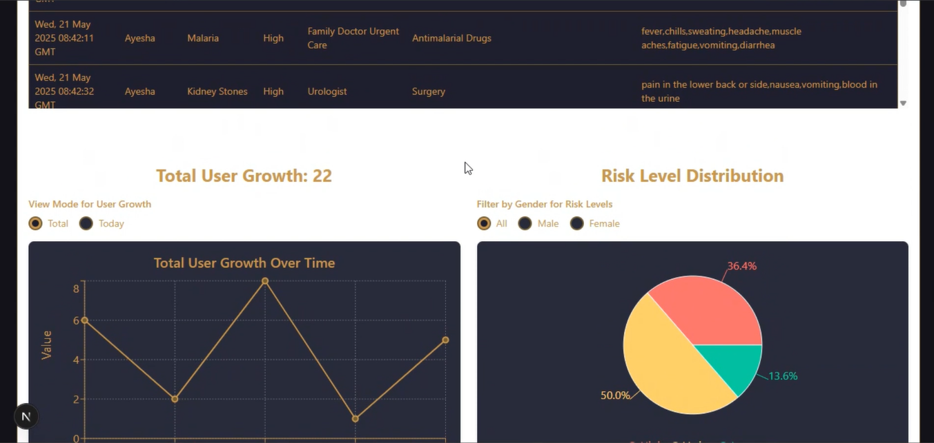 The admin dashboard is built using Python (Flask) for backend APIs and Firebase for real-time data storage and user analytics. It leverages Recharts and Plotly to present over 15+ visualizations, including user trends, illness distribution, and system-wide usage metrics. Tailwind CSS and Next.js were used for the frontend components of the analytics panel.