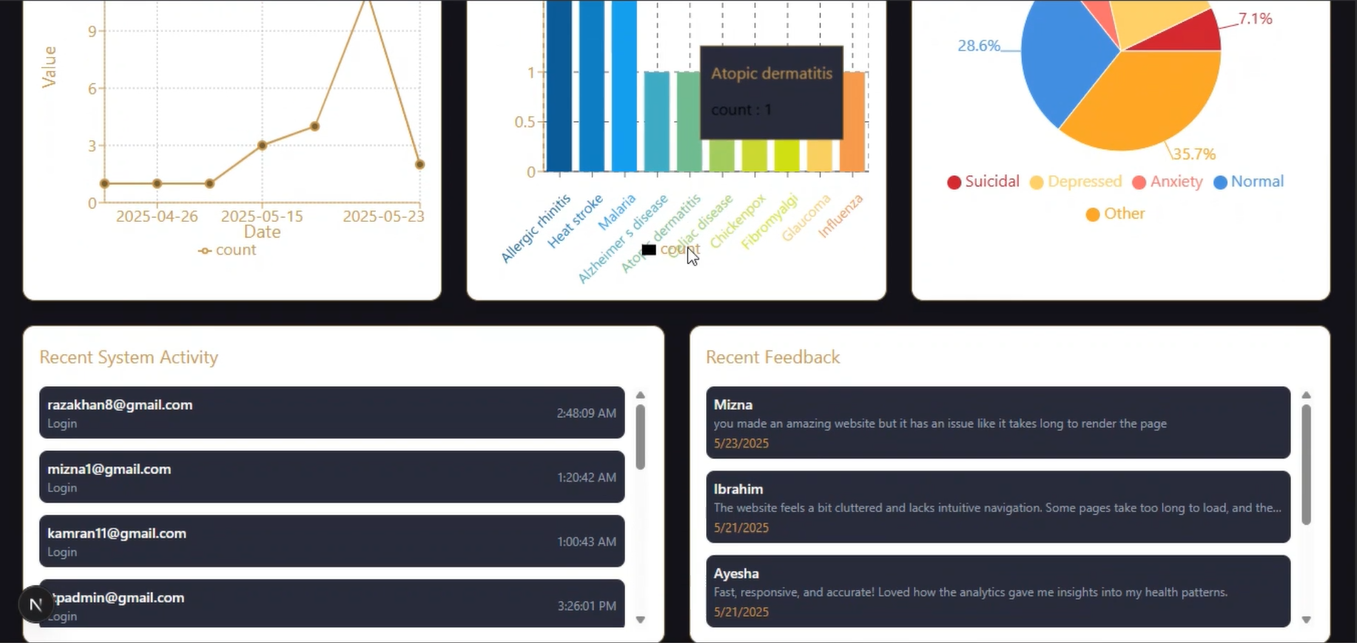 This admin dashboard is part of an AI-powered healthcare platform, designed to offer deep insights into user behavior and prediction trends. It helps system administrators monitor and evaluate how users are interacting with the AI tools provided on the platform.