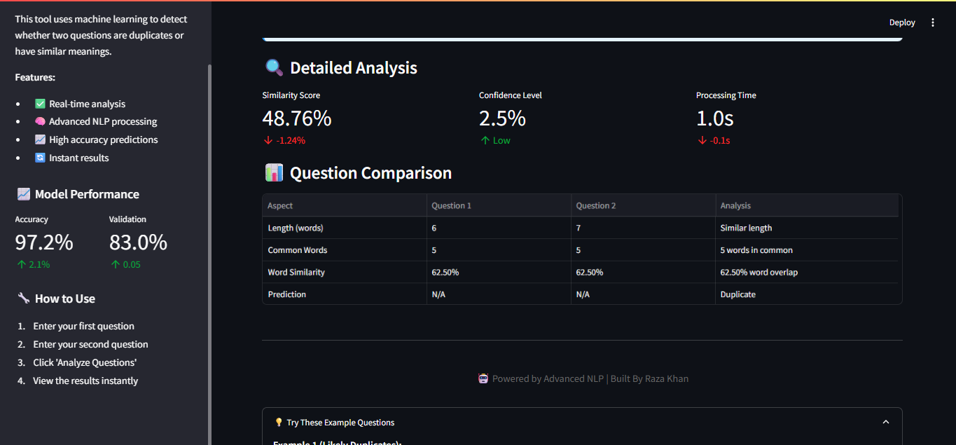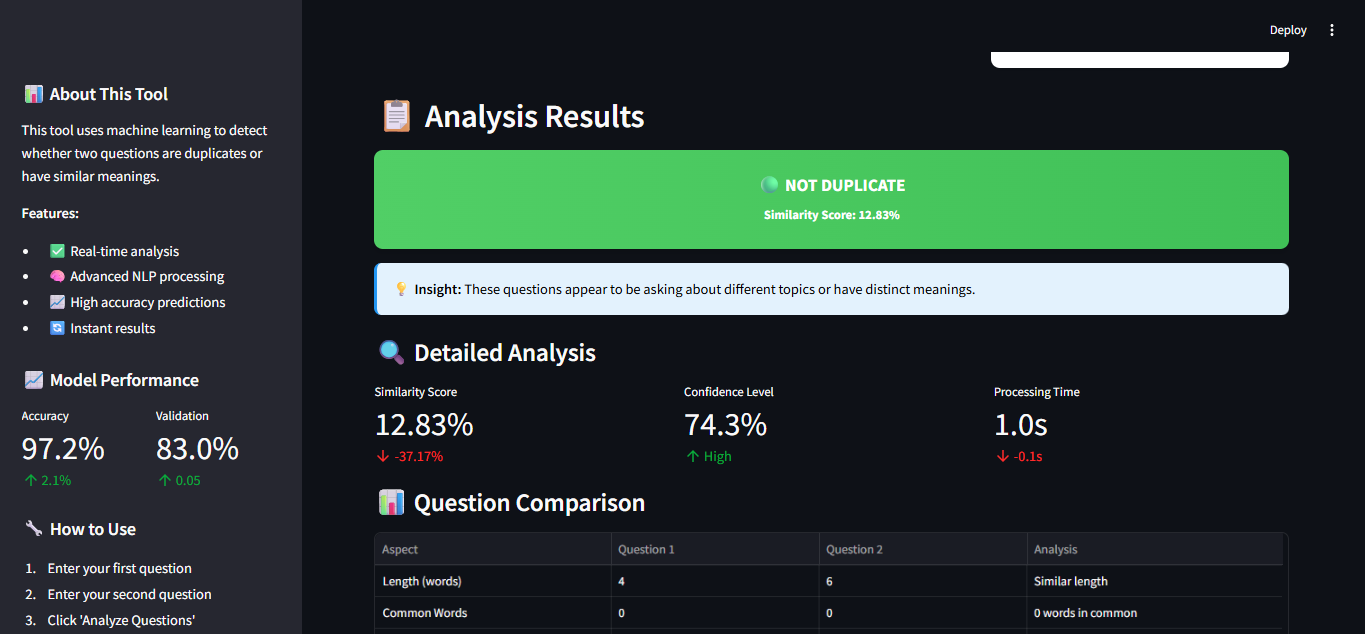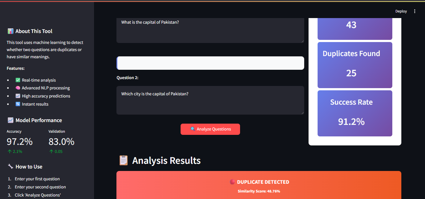 Duplicate Question Detector is a web-based application designed to identify whether two questions are semantically similar or duplicates. Users input two questions, and the system processes them through a trained LSTM neural network to predict their similarity with high accuracy.